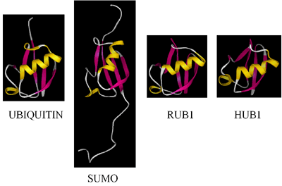 Despite fairly limited primary sequence homology, ubiquitin and ubiquitin-like proteins share very similar tertiary structures. Owing to their size and therefore greater informational complexity, tagging proteins with these peptides potentially offers greater versatility in regulation of cellular signaling than reversible modification by smaller tags (e.g. phosphorylation). Images are from the National Center for Biotechnology Information.