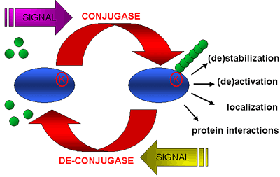 Post-translational modification of receptors and signaling intermediates by protein tags regulates their functions. In the generic system depicted, a signal promotes conjugation of a tag to a target via an isopeptide bond between a lysine residue in the substrate and the C-terminus of the tag. A monomer or chain of tags might affect the stability of the target, its activity, its subcellular localization or its capacity to bind interacting partners. An antagonistic signal might reverse these functions by activating a protease that cleaves the tag from the substrate.